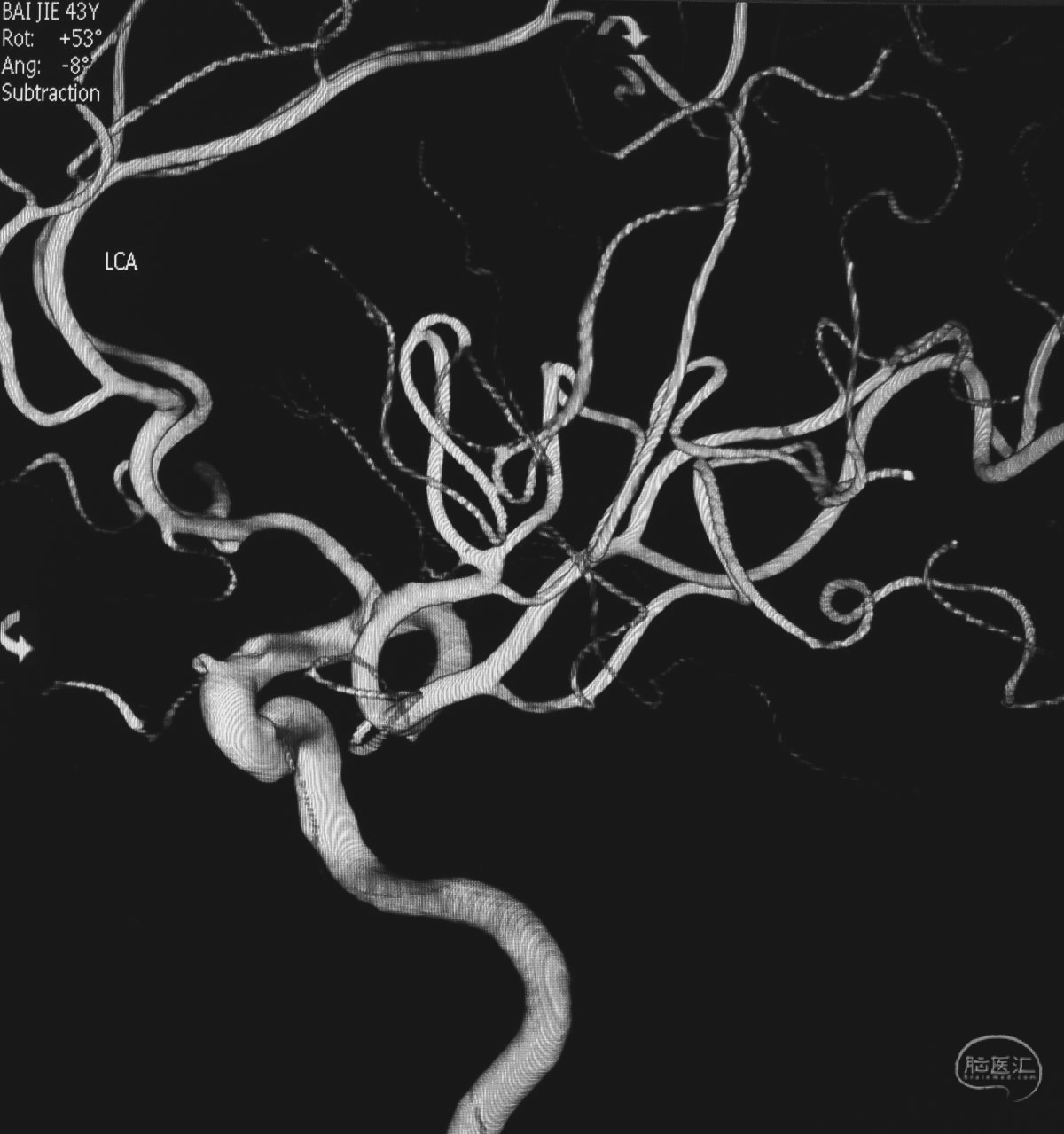 术后左颈内动脉造影三维重建显示动脉瘤消失。