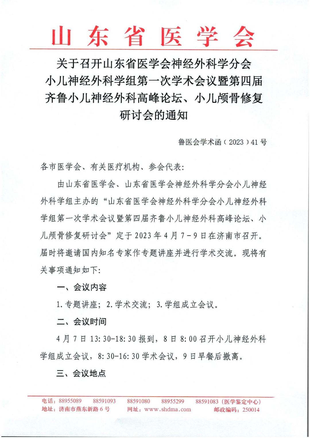 【会议通知】山东省医学会神经外科学分会小儿神经外科学组第一次学术会议暨第四届齐鲁小儿神经外科高峰论坛、小儿颅骨修复研讨会