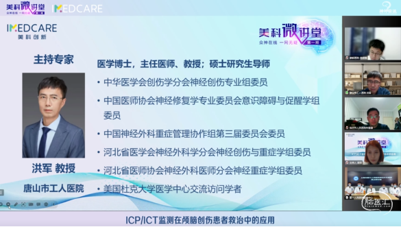 唐山市工人医院洪军教授致辞表示,非常高兴能够有机会在线上与高亮教授及各位专家同道共同探讨颅内压和脑部监测在临床上的应用,相信通过彼此的交流,大家会在有关颅内压以及脑部监测的认识上有很大的提升。