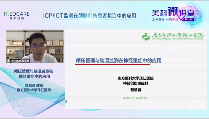 南方医科大学珠江医院曾慧君教授作“颅压管理与脑温监测在神经重症中的应用”的专题发言,以一例“左侧额顶叶脑出血病例”为例,结合临床指南共识,分享了以ICP为基础的神经多模态监测的优势:1)以颅内压监测为基础的多模态管理可指导临床处置,使患者受益;2)目标温度管理是控制颅内压,减少继发脑损伤重要手段。