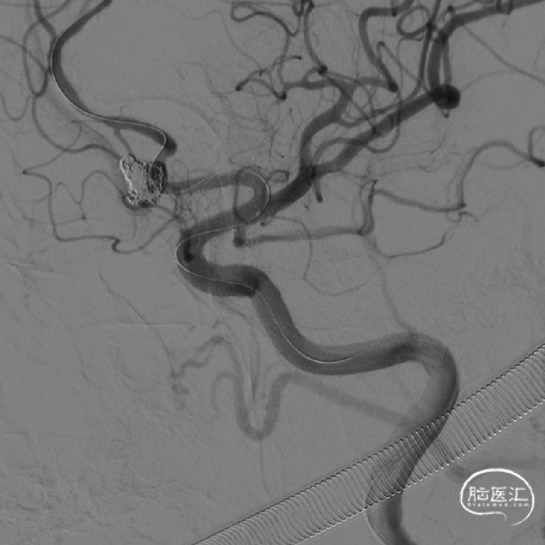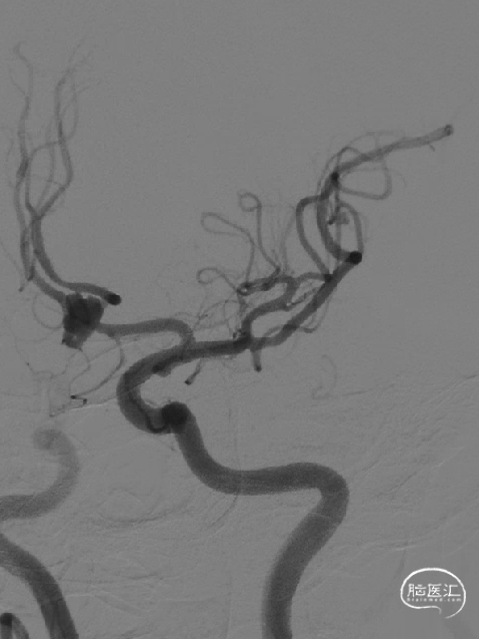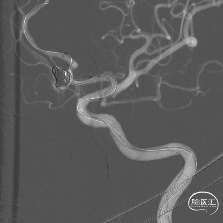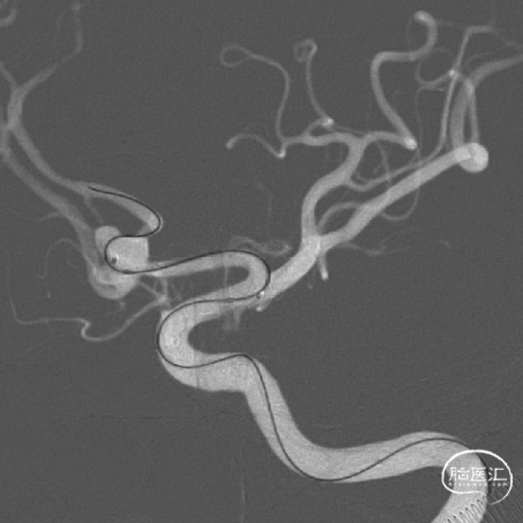 由于动脉瘤颈累及双侧A1-A2,所以右侧颈内动脉也留置导管,可以随时造影观察右侧A1-A2是否通畅。也为必要时进一步治疗预留技术空间。