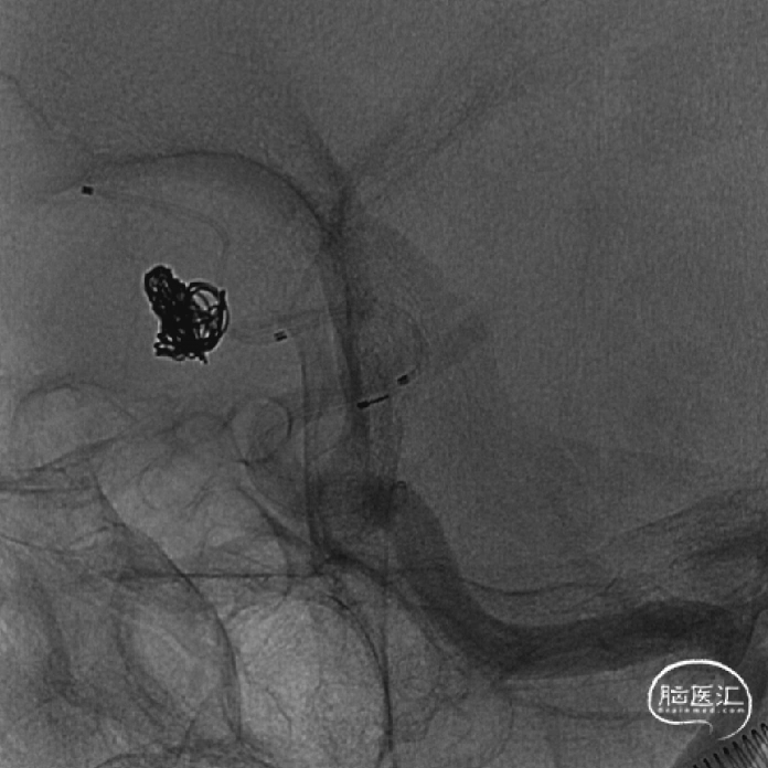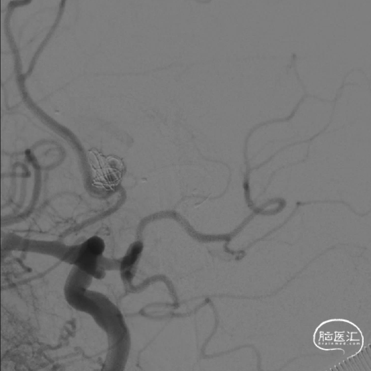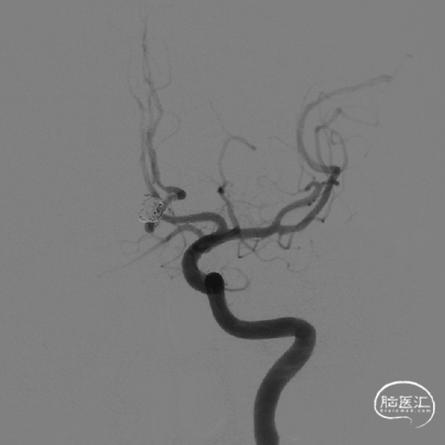 释放支架后继续填塞至动脉瘤不显影。双侧A1-A2显影良好。患者术后神经体检正常。