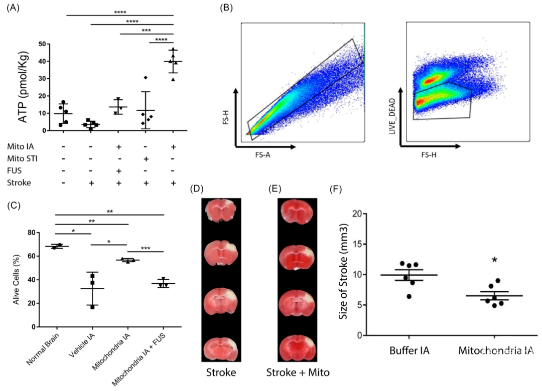 A.发生急性缺血性卒中时,大脑的ATP水平。卒中后同侧半球ATP水平下降,FUS辅助动脉内注射线粒体(Mito IA+FUS)以及直接立体定向注射线粒体(Mito STI)后ATP恢复。没有FUS辅助的动脉内线粒体注射组(Mito IA)提供的ATP水平明显高于其他组,甚至超过正常对照水平。B和C.流式细胞术用于评估线粒体移植后脑卒中半球的细胞活力。B.用于分离活细胞群和死细胞群的门控策略。C.图示卒中半球的活细胞百分比。使用缓冲液输注作为对照(缓冲液IA),在tpMCAo后,卒中半球的细胞活力显著下降。动脉内注射线粒体(Mito IA)显著挽救缺血组织中的细胞活力。在本实验中,FUS辅助的线粒体注射(Mito IA+FUS)并没有提高细胞活力。动脉内线粒体注射后梗死面积减小。采用远端MCA凝血法诱发卒中,缺血1小时后在动脉内注射线粒体或缓冲液;24小时后采集大脑,用TTC进行梗死染色。D. pdMCAo的卒中小鼠和E.线粒体注入小鼠(卒中+Mito)采用代表性TTC染色大脑。F.评估经动脉内注射缓冲液(Buffer IA)或线粒体(线粒体IA)后各组小鼠之间的梗死面积,动脉内注射线粒体组的平均梗死面积减少34%。