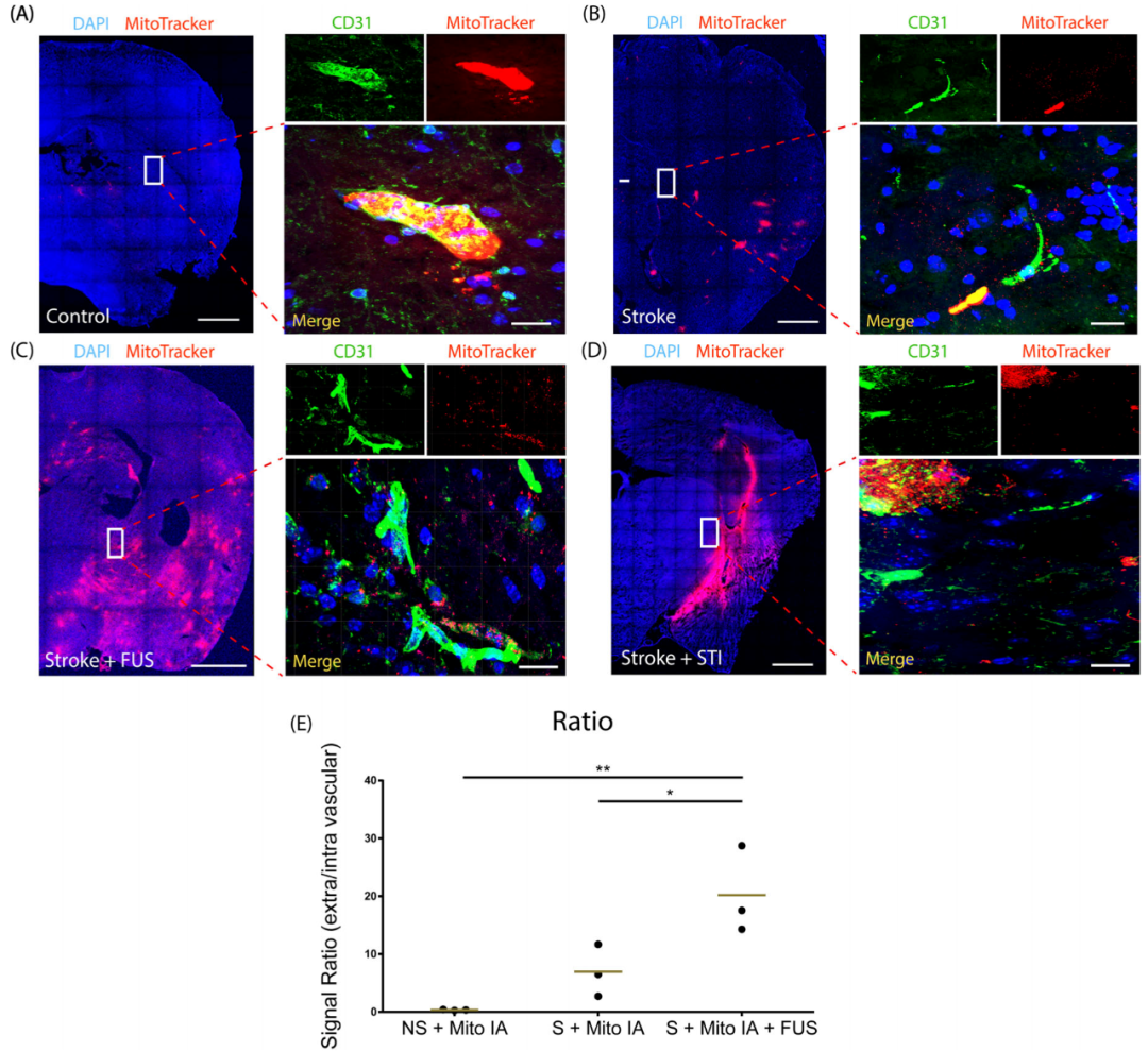 A.经动脉注射线粒体在正常大脑实质中的有限扩散。比例尺,700µm。高倍图像显示cd31标记血管中荧光标记线粒体的细节。比例尺,15µm。B.急性缺血性卒中经动脉注射线粒体。DAPI染色半球图像显示梗死核心处线粒体密度最高,提示外渗。在高倍图像中,脑实质和血管内外均检测到线粒体信号。C.经动脉注射线粒体进入急性缺血性卒中,随后进行FUS+MBs后,观察到卒中半球线粒体的渗透性增加,包括缺血半暗区。此外,在放大的图像中,血管中的线粒体沉积并不常见。D.为了比较,对卒中进行直接立体定向注射。这导致一个较强大的载荷和有限的扩散。高倍图像显示实质中线粒体密度的波动,血管中线粒体信号缺失。E.图中总结血管外和血管内的信号比率。NS+Mito IA,对照组脑动脉内线粒体注射;S+Mito IA,卒中组脑动脉内线粒体注射;S+Mito IA+FUS,卒中组脑动脉内线粒体注射,聚焦超声辅助。
