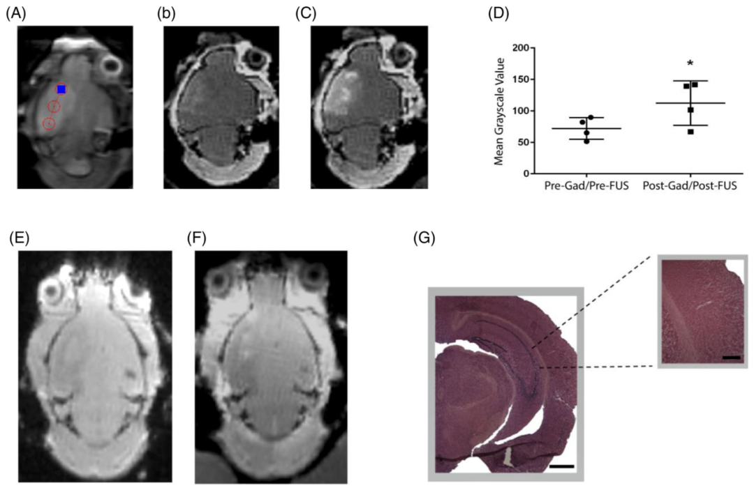 A-C. tpMCAo后诱导的急性缺血性卒中小鼠用Gd-DTPA增强MRI成像,暴露于FUS,并使用Gd-DTPA标注成像。A. T2序列显示卒中区域和3个选定的FUS目标(红色圆圈)。B. T1加权序列证实在FUS前缺血性卒中区中的Gd-DTPA增强。C. T1加权序列显示FUS后在目标区域有Gd-DTPA显著增强。D.显示在FUS后,Gd-DTPA增强磁共振成像像素灰度显著增加。这些数据表明,暴露在FUS下的缺血脑组织中存在大量的血脑屏障开放。E.FUS超声检查前和F.检查后的GRE序列,提示未检测到出血性并发症。G.组织学染色证实无微出血。对暴露脑区进行H&E染色连续切片,均未发现微出血。