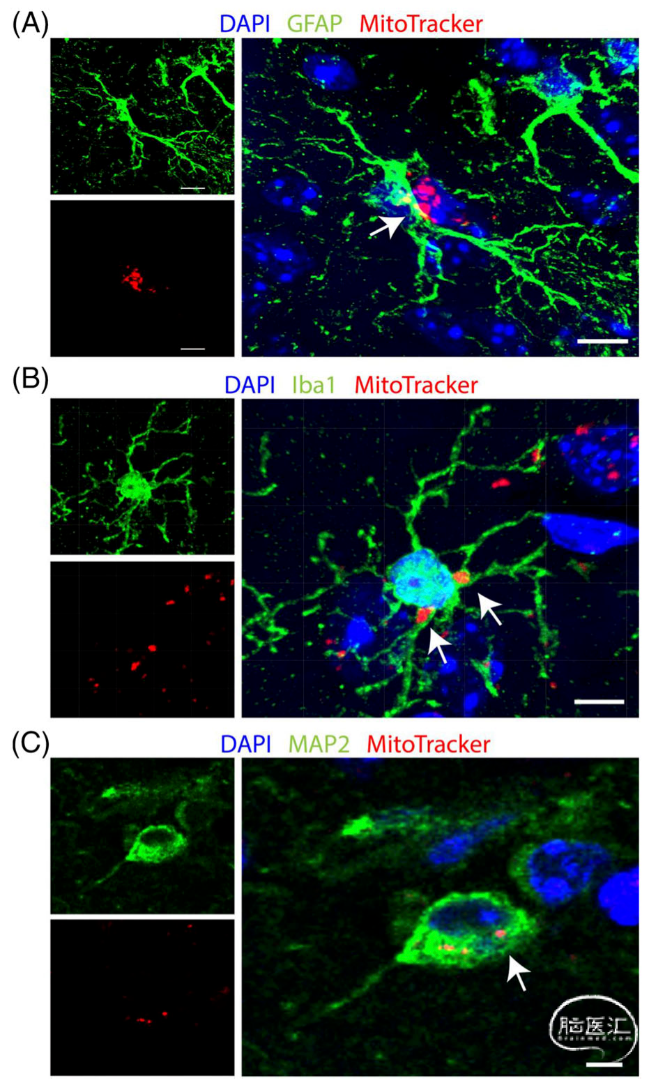 高功率共聚焦图像显示,在聚焦超声(FUS)辅助的线粒体移植后,大脑中多种细胞可以整合外源性线粒体。A.GFAP阳性的星形胶质细胞;B. Iba1阳性的小胶质细胞;C.MAP2阳性的神经元被发现含有mito示踪剂标记的外源性线粒体(白色箭头)。