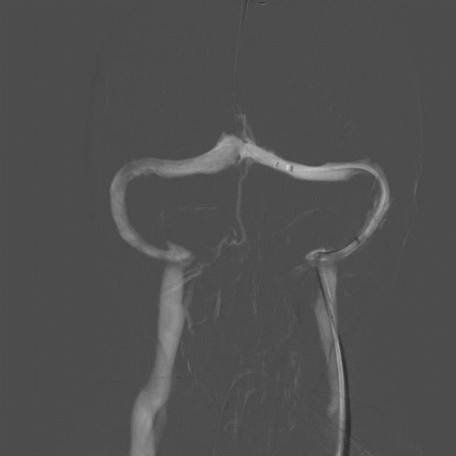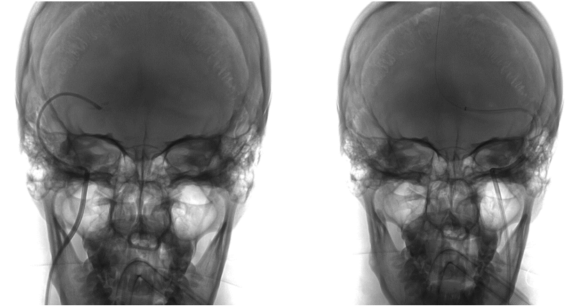 再次将XT-27微导管穿过支架送至横窦远心端,对支架远近端进行测压,支架远端压力22mmHg,近端21mmHg,压力差为1mmHg。复查造影提示左侧横窦狭窄显著改善,DynaCT未见颅内出血。遂结束手术。