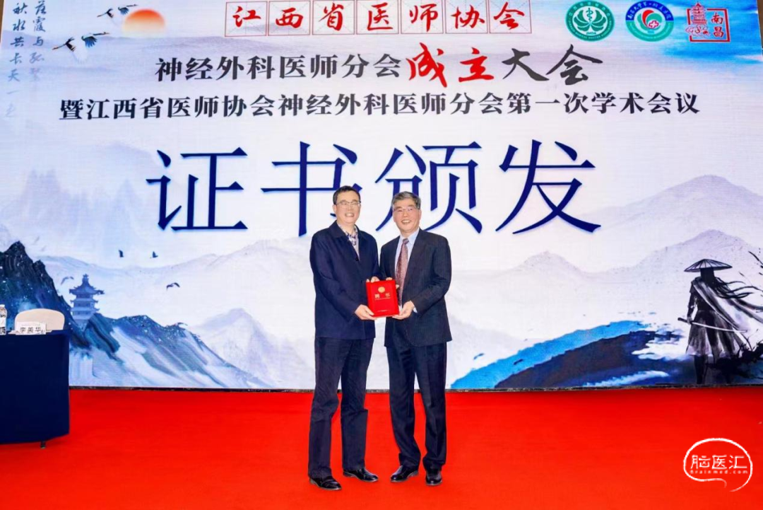 现场由江西省医师协会雷良华会长对新当选的神经外科医师分会会长洪涛教授颁发会长证书。