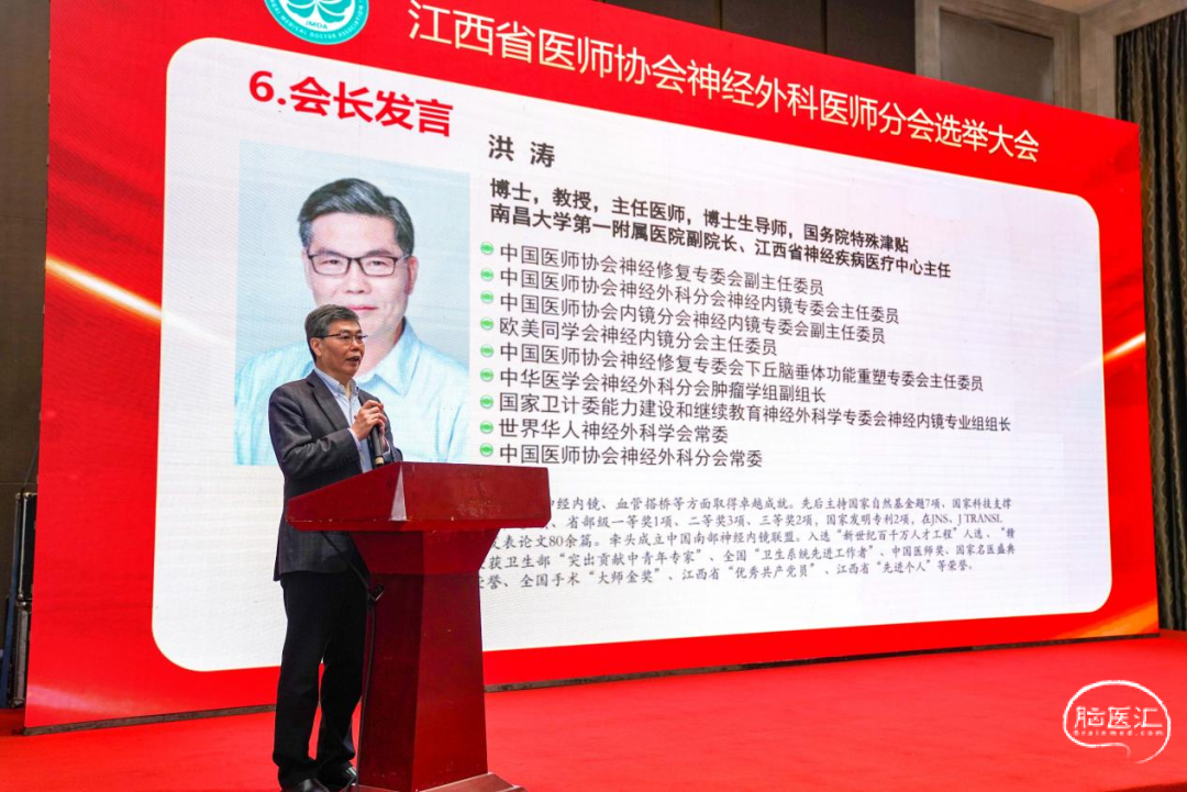 洪涛教授当选会长后做表态性发言,他表示分会将在省卫生健康委、省医师协会领导下和各位委员支持下,团结带领省内神经外科医师,以全面提高江西省神经疾病医疗诊疗水平为目标,以服务患者为宗旨,踔厉奋发,为我省神经外科事业作出更大的贡献。