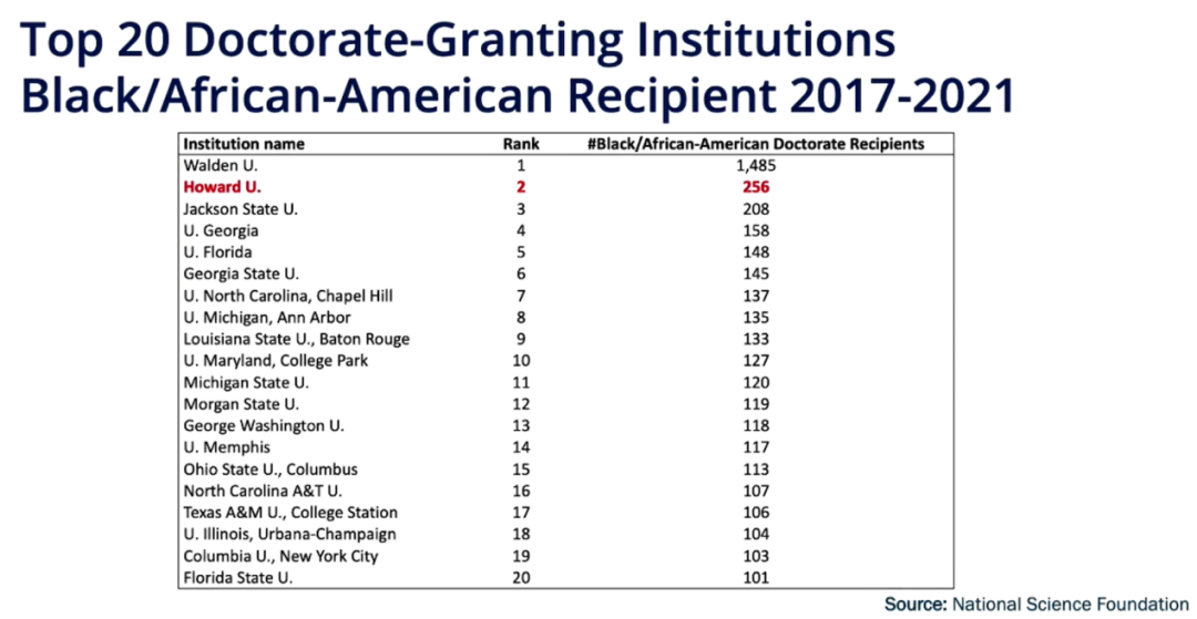 除此以外,Wayne教授还提到了新冠肺炎的流行让我们更加清楚地认识到不同肤色人群在健康方面的不平等,这更加让我们意识到医学教育和健康产业重要性。一方面我们提高医学院校招生时的多样性,另外一方面为学生提供更加强大的资金支持。而且,我们应该注意到HBCUs在其中至关重要的作用:大概34%的美国黑人在生理、化学、天文学、数学等专业的学士学位来源于HBCUs,在科学和工程学方面获得PHD学位黑人人数前十名的学校中,有八个是HBCUs。