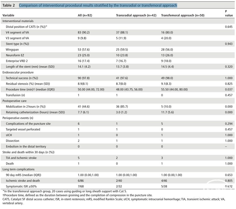 该研究共有92例病例(42例经桡动脉入路,50例经股动脉入路),研究表明,经桡动脉入路穿刺部位并发症、术后留置导尿、围手术期事件均优于经股动脉入路。