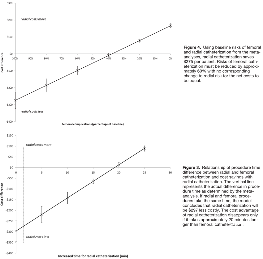 经桡动脉入路较经股动脉入路时间多花费3分钟,但经桡动脉入路可为患者节约成本。
