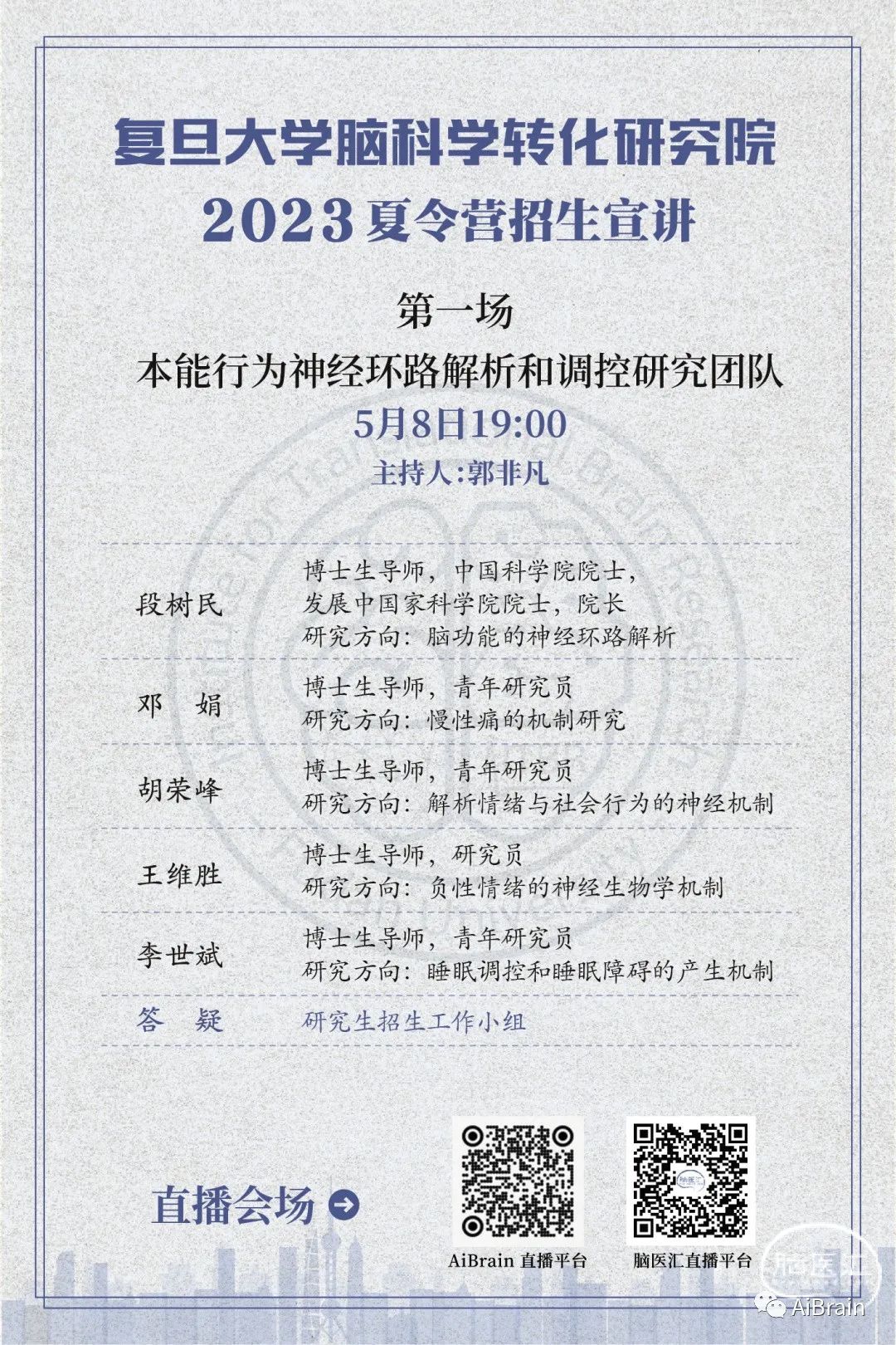 为了招收优秀本科毕业生来复旦大学脑科学转化研究院(以下简称复旦脑转化院)攻读硕士或博士学位,以及吸引优秀博士毕业生加入复旦脑转化院博士后队伍,共谋科研发展事业,针对2023年全国优秀大学生夏令营活动和博士后招聘计划,复旦脑转化院将推出系列宣讲活动。