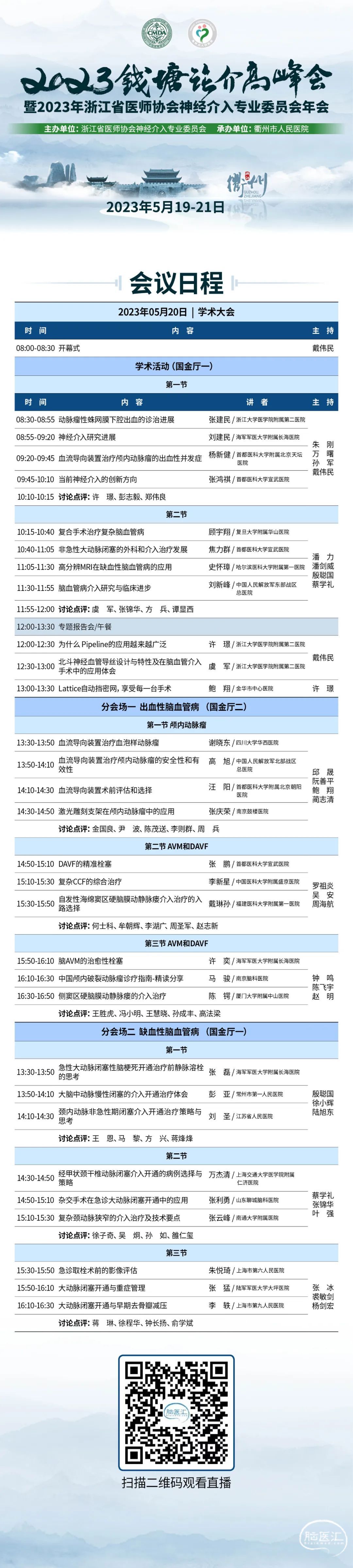 【5月20日 8:00直播】2023钱塘论介高峰会暨2023年浙江省医师协会神经介入专业委员会年会,欢迎观看!