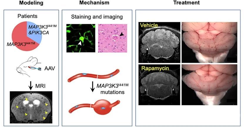 本研究采用中枢神经系统内皮特异性的BR1血清型AAV病毒,建立了表达 MAP3K3 I441M突变的脑和脊髓海绵状血管畸形小鼠模型,检测到与MAP3K3I441M患者相似的病理表型,并通过双光子活体成像和基因标记的方法结合,观察到了MAP3K3I441M过表达突变内皮细胞诱导脑海绵状血管畸形发生发展及破裂出血的动态过程,发现海绵状血管畸形始于突变血管内皮细胞扩张及血脑屏障的破坏。此外,研究团队还发现,应用mTOR抑制剂雷帕霉素可以减轻MAP3K3I441M诱导的小鼠脑海绵状血管畸形出血表型。这一工作为散发性脑脊髓海绵状血管畸形的发病机制提供了重要线索,并提出了有前景的药物治疗靶点。