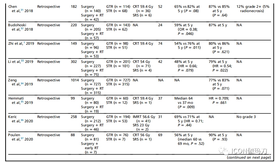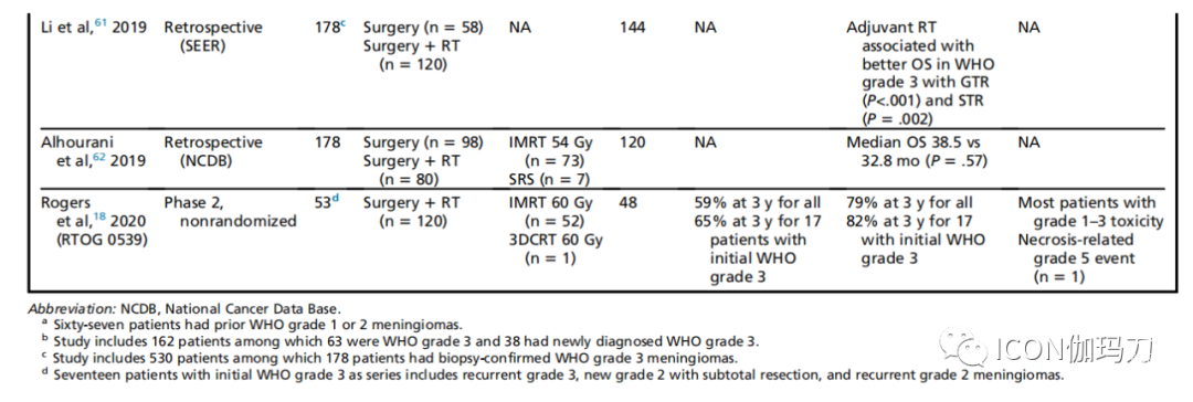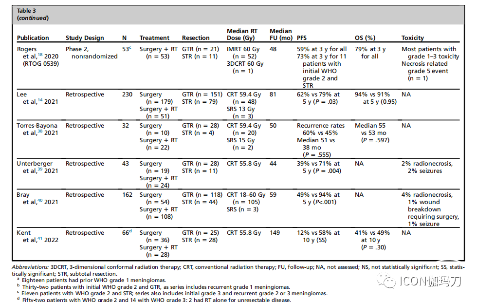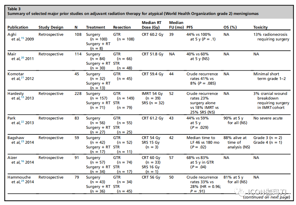 表3既往关于不典型(WHO2级)脑膜瘤辅助放疗的主要研究摘要
