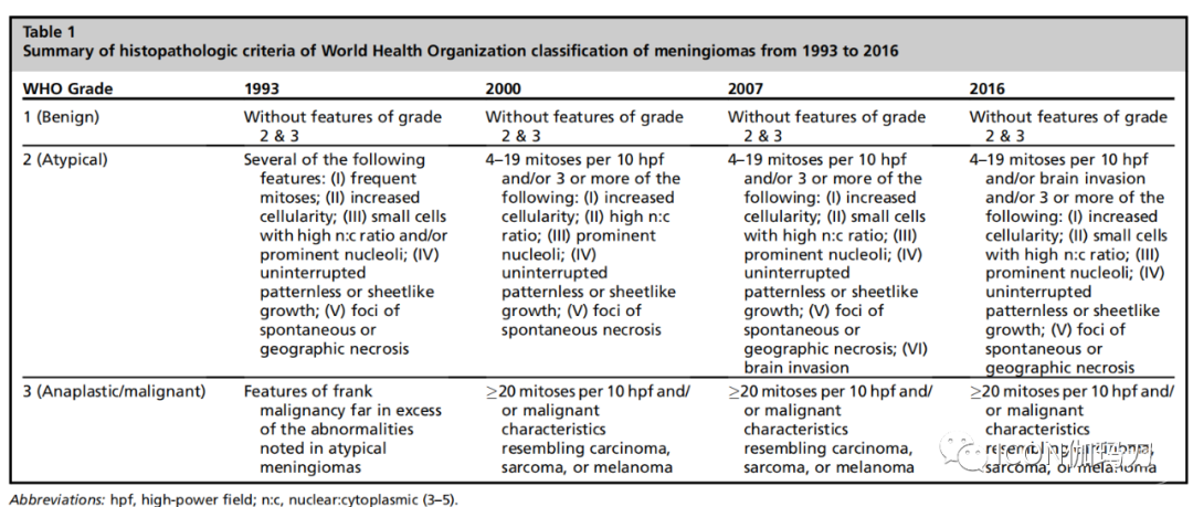 表1 1993—2016年世界卫生组织脑膜瘤分类的组织病理学标准总结。