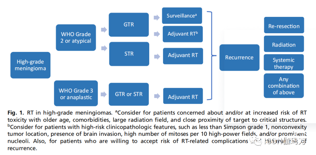 图1。高级别脑膜瘤的放射治疗。a考虑到患者年龄较大、有合并症、照射野大、靶区靠近关键结构,担心和/或放疗毒性风险增加。b考虑具有高危临床病理特征的患者,如小于Simpson分级1级、肿瘤位置非凸面、存在脑侵袭、每10个高倍视野有大量核分裂象和/或明显的核仁。以及,对于愿意接受放疗相关并发症风险和最小复发风险的患者。