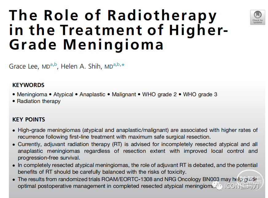 《Neurosurgery of Clinical North America》杂志 2023 年7月刊载[34(3):463-478.]美国麻省总院的Grace Lee , Helen A Shih撰写的综述《放疗在高级别脑膜瘤治疗中的作用The Role of Radiotherapy in the Treatment of Higher-Grade Meningioma》(doi: 10.1016/j.nec.2023.02.013. )。