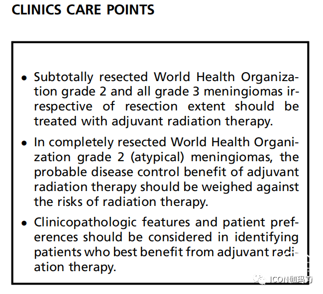 总之,高级别脑膜瘤(WHO 2级和3级)在接受最大限度安全手术切除的初始治疗后,复发风险增加。回顾性数据和少数前瞻性非随机研究的证据支持放疗在辅助治疗和挽救性治疗中发挥重要作用。考虑到LC、PFS和潜在OS获益,目前建议对次全切除的2级以及不考虑切除程度的所有3级脑膜瘤进行辅助放疗。对于全切除的2级脑膜瘤,尽管最近的两项前瞻性观察性研究(RTOG-0539和EORTC 22042-26042)表明,接受辅助放疗的这类患者具有良好的结局,但在回顾性研究中,辅助放疗的时机仍存在争议。在选择辅助放疗还是密切监测时,应考虑潜在的治疗毒性和临床病理特征以及患者的个人偏好。“ROAM/EORTC- 1308”和“NRG Oncology BN003”的研究结果有望改变临床实践,并指导完成切除的不典型脑膜瘤的最佳术后管理。