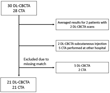 在CTA成像比较中发现,由双能扫描重建的虚拟单能图像(VMIs)较传统多能图像具有更高的图像质量,从而提高了对颅内血管的诊断评估。采用双能VMI重建的CBCTA图像,通过减少波束硬化伪影,和提高对比噪声比(CNR)处理后其影像质量显著提高。由于先前关于CBCTA的研究规模小、异质性强、选择性差,因此来自瑞典卡罗琳斯卡大学附属医院的Ståhl, F.等开展前瞻性试验,评估DL-CBCTA和CTA检查卒中患者动脉时的重要作用,CTA的非劣效性。相关内容已于2023年4月13日在线发表于《American Journal of Neuroradiology》。