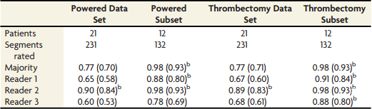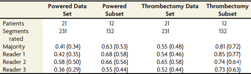 该研究共纳入了21名平均年龄为72岁的患者,并进行了匹配的图像集评估。在排除运动或造影剂注射问题后,所有的研究者都单独认为DL-CBCTA在评估颅内血管取栓的相关动脉时优于CTA(置信区间边界分别为93%、84%和80%)。相对于CTA,DL-CBCTA的伪影更为普遍。此外,与CTA相比,大多数评估认为除了M1以外的每个独立节段都具有显著的非劣等性。