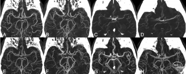 图2. DL-CBCTA 70 kev图像(上)和CTA(下),MIP切片厚度为35mm。A-B. 质量可接受的DL-CBCTA扫描。C-D. 受运动伪影影响的数据集中的典型扫描。下一行(E-H)为相应的CTA。F、G和H显示右侧MCA闭塞,在DL-CBCTA成像时已被解决。本研究仅评估了未受影响半球的动脉解剖。
