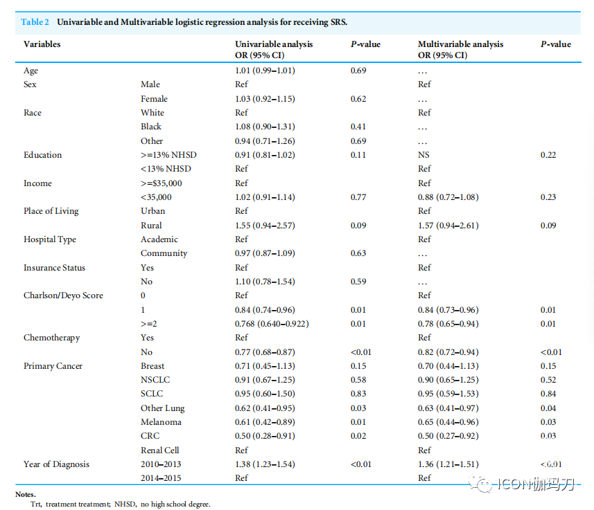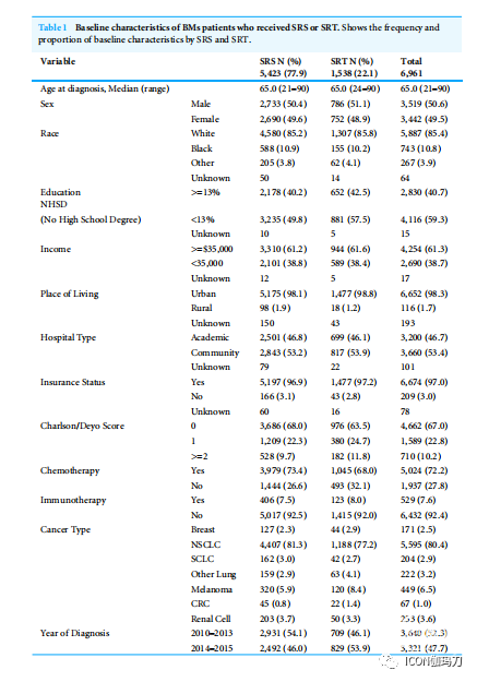 比较SRT组和SRS组患者的OS情况。其他感兴趣的变量是诊断时的年龄,包括诊断时的年龄、性别、种族、教育水平、收入、居住地点、医院类型、保险状况、查尔森/德约评分、化疗方案、原发癌类型和初次诊断的年份。是否接受SRS或SRT治疗的预测因素包括性别、种族、教育程度、收入、居住地点、医院类型、保险状况、Charlson/Deyo评分、化疗治疗情况、免疫治疗情况、原发肿瘤类型和原发肿瘤诊断年份。