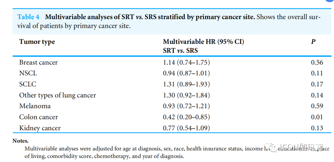 本研究纳入了在NCDB中患有乳腺癌、非小细胞肺癌、小细胞肺癌、其他肺癌、黑色素瘤、结直肠癌或肾癌的患者,这些患者在原发癌症诊断时已发生脑转移,并接受了SRS或SRT治疗其脑转移。我们采用Cox比例风险分析方法分析了OS,该方法在单变量分析中调整了与OS改善相关的变量。