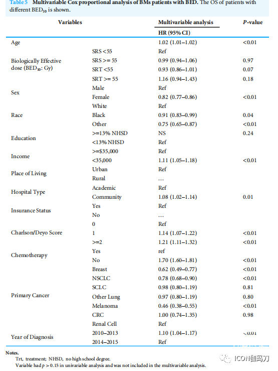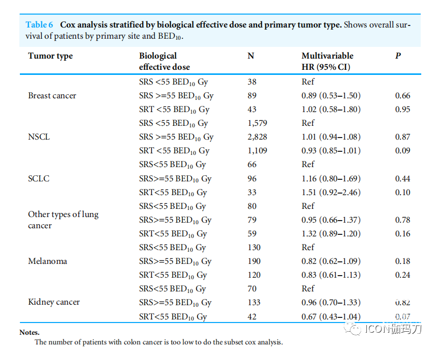 在我们的研究中,接受高剂量分割放疗(SRT)的患者的中位生存期(11.3个月)略低于单一机构的数据(14.8个月)。差异可能是我们的数据包括了原发癌症为NSCLC、乳腺癌、黑色素瘤、CRC和肾癌的癌症患者。此外,该研究是基于单一研究所和小样本量。相比之下,通过这一分析发现的中位生存期(10.91个月)与之前一项研究发现的接受SRS治疗的脑转移患者的中位总生存期(10.4个月)非常相似。Minniti等人进行了一项研究,试图识别每种类型的放射治疗的神经毒性风险,因为有人建议分割SRT减少辐射对健康组织的伤害,并发现高剂量放射治疗可能更有利于控制和降低较大(>2 cm)脑转移恶性肿瘤的放射性毒性风险。此外,Putz等进一步探索了脑转移瘤的局部控制和RN风险,发现有证据表明SRT在治疗较大转移瘤中提供的益处可能也适用于较小转移瘤。根据BED10对SRS和SRT进行分层时,SRS和SRT对OS的影响差异无统计学意义,提示纳入研究的SRS和SRT高于或低于BED10 (55 Gy)同样有效。同样,Putz等的研究表明,在接受分割SRT的患者与接受单次SRS治疗的患者之间,总体生存无显著差异。有趣的是,在一项子集分析中,我们确实发现,在原发性结肠癌患者中,与SRS相比,SRT与OS改善相关。结肠癌患者的脑转移瘤通常比其他原发癌患者的脑转移瘤更大。出于安全性考虑,较大肿瘤的SRS剂量通常会降低。遗憾的是,按BED10分层后,结肠癌患者数量太少,无法进行亚组cox分析。
