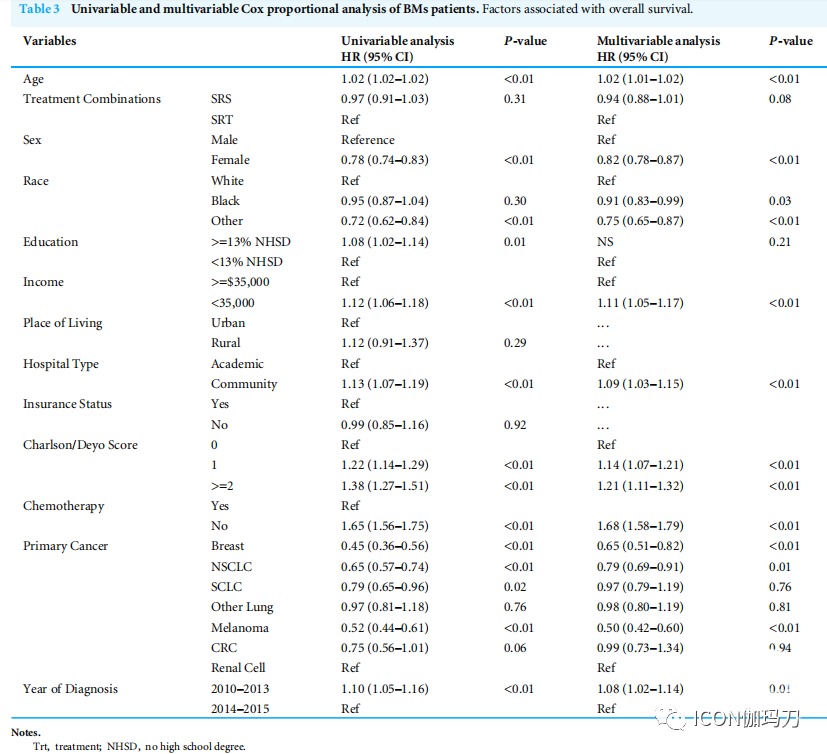 本研究的目的是分析接受SRS治疗和接受SRT治疗脑转移患者的OS差异。单因素或多因素Cox回归分析均未发现放疗类型与OS改善之间有显著相关性。