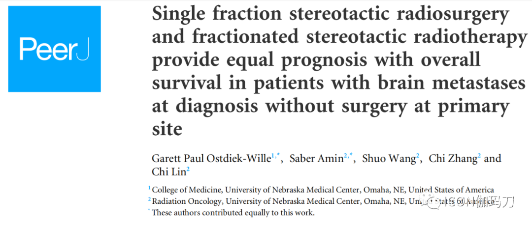 《PeerJ》杂志 2023 年5月 19日在线发表美国University of Nebraska Medical Center的Garett Paul Ostdiek-Wille , Saber Amin , Shuo Wang ,等撰写的 《对于原发灶未接受手术的脑转移瘤患者,单次分割立体定向放射外科治疗和分割立体定向放射治疗具有相同的预后和总体生存期。Single fraction stereotactic radiosurgery and fractionated stereotactic radiotherapy provide equal prognosis with overall survival in patients with brain metastases at diagnosis without surgery at primary site》(doi: 10.7717/peerj.15357.)。