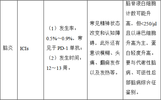 氨甲蝶呤可致多种中枢神经系统并发症,如无菌性脑膜炎、脊髓病、急性或亚急性脑病和后部白质脑病综合征。异环磷酰胺治疗中可出现嗜睡、精神错乱、抑郁、幻觉、眩晕、定向力丧失和脑神经功能障碍等多种症状。左旋门冬酰胺酶治疗儿童急性淋巴细胞白血病可诱发静脉窦血栓形成。环磷酰胺或顺铂可能诱发可逆性白质脑病综合征。利妥昔单抗长期使用与进展性多灶性脑白质病有关。伊匹单抗可致许多不同自身免疫性神经系统综合征,如垂体炎(导致中枢性甲状腺功能减退、肾上腺功能不全和性腺功能减退)、类似格林-巴利综合征的运动性轴索型多神经根病、重症肌无力、横断性脊髓炎和炎症性肌病。