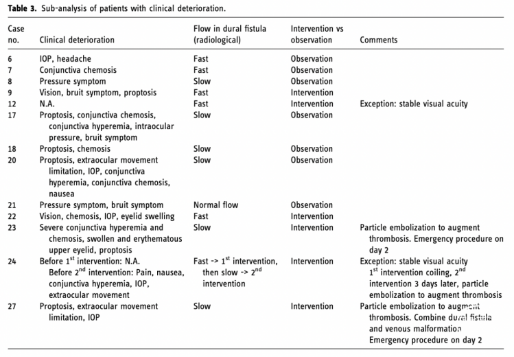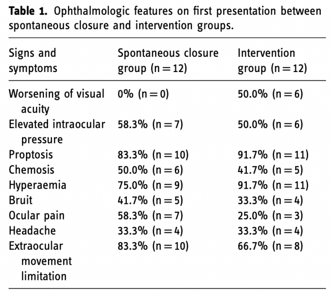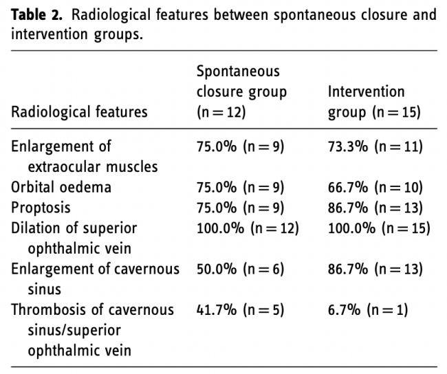 21例眼球突出,20例结膜充血,18例眼外活动受限,13例眼压升高,11例结膜水肿,10例眼部疼痛,9例眼部淤青,8例头痛,6例视力恶化。在干预组中,5名患者的视力与基线相比有所下降,这是由于CSDAVF继发的充血,但在血管内干预后有所改善。在自发闭合组中,视力通常不受影响。影像学表现上,与接受干预的患者相比,眼上静脉血栓形成和CSDAVF的病灶自发消退之间存在一致性。在CSDAVF的放射学成像中,尽管流量减少或静脉回流停滞,但眼部症状却出现反常增加。