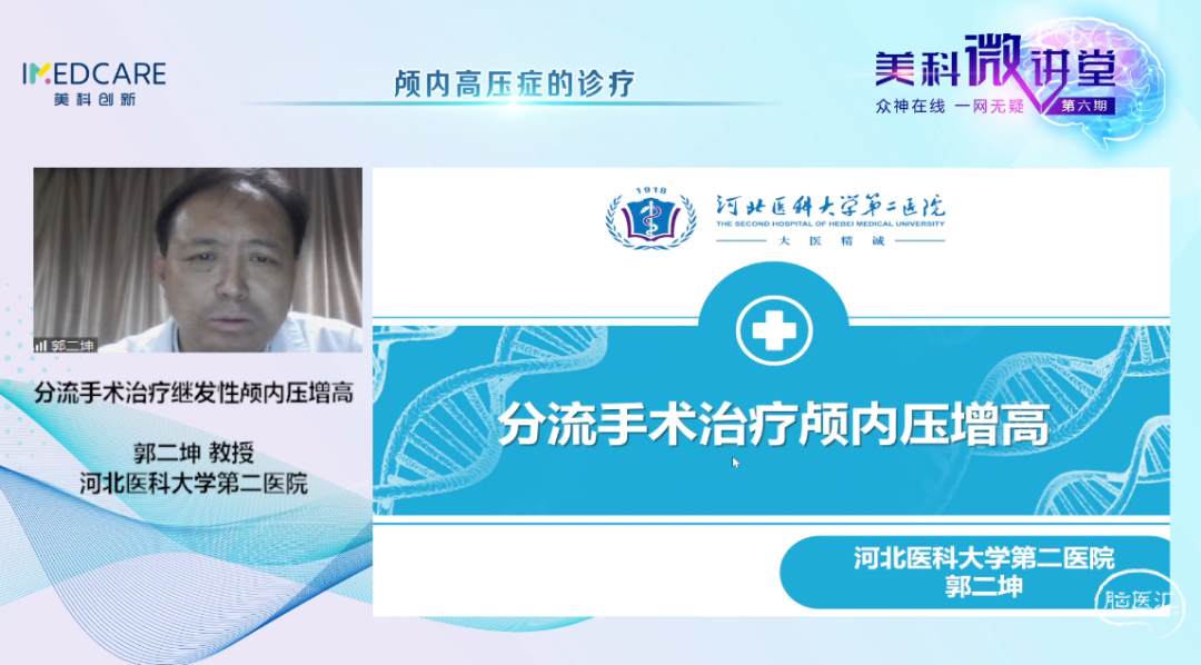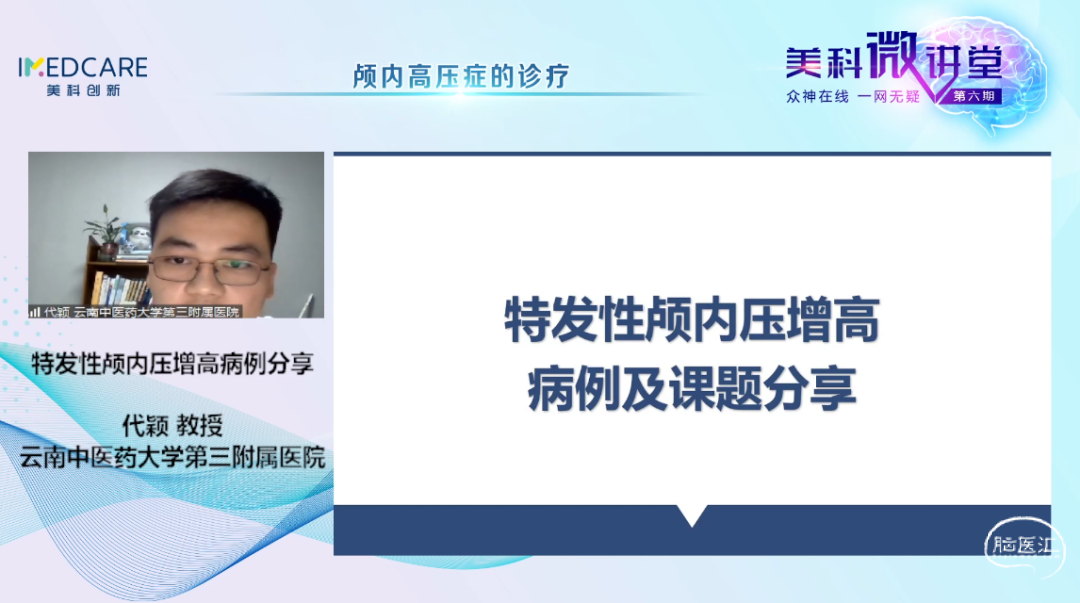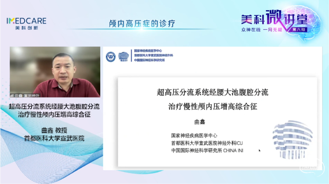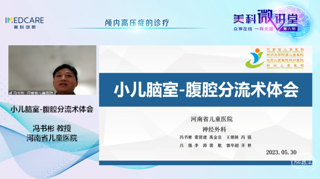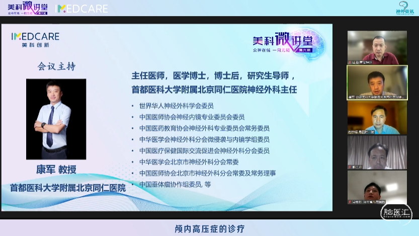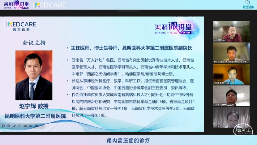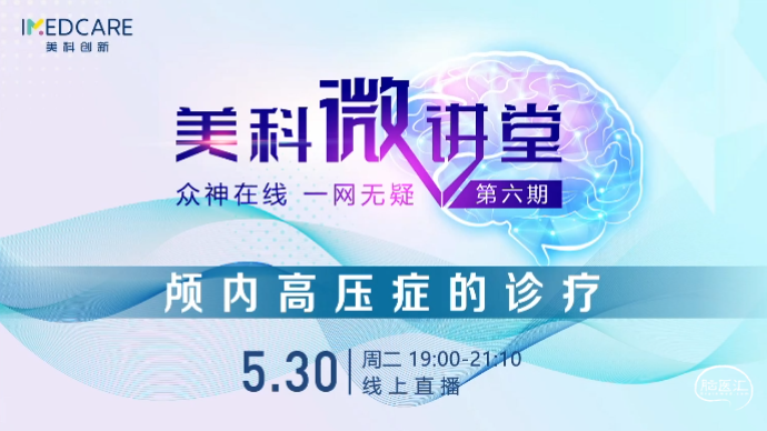 5月30日,“众神在线 一网无疑”美科微讲堂(第六期)成功举办。本期会议由昆明医科大学第二附属医院赵宁辉教授、首都医科大学附属北京同仁医院康军教授主持,特邀首都医科大学宣武医院曲鑫教授、河南省儿童医院冯书彬教授、河北医科大学第二医院郭二坤教授和云南中医药大学第三附属医院代颖教授带来精彩的专题讲座。与会专家们围绕本期主题——“颅内高压症的诊疗”展开了详尽而深刻的探讨,干货满满,回味无穷。