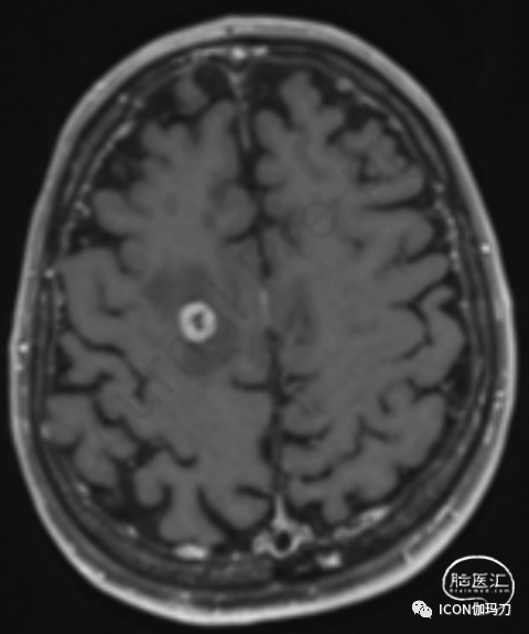 图1。同步接受立体定向放射外科和免疫检查点抑制剂治疗的患者的轴位MRI切片。MRI描述了一个影像学定义的放射性坏死病例,该病例经药物治疗后无并发症