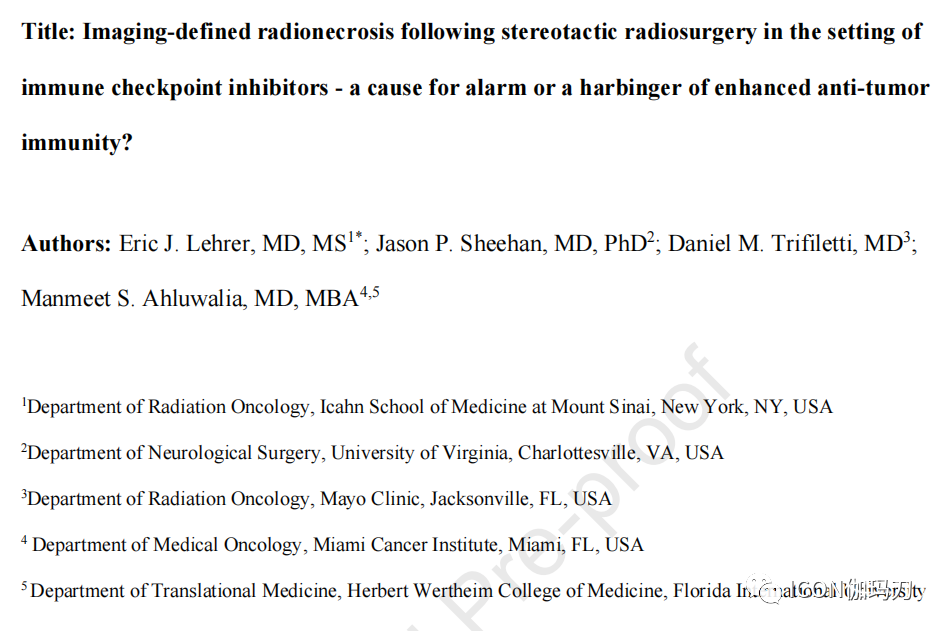 《World Neurosurgery》杂志. 2023 年6月19日在线发表美国纽约 Icahn School of Medicine at Mount Sinai的Eric J Lehrer , University of Virginia,的Jason P Sheehan , Mayo Clinic的Daniel M Trifiletti ,Florida International University的 Manmeet S Ahluwalia撰写的来信《在使用免疫检查点抑制剂的情况下,立体定向放射外科治疗后影像学定义的放射性坏死——是作为抗肿瘤免疫增强的警报还是先兆?Imaging-defined radionecrosis following stereotactic radiosurgery in the setting of immune checkpoint inhibitors - a cause for alarm or a harbinger of enhanced anti-tumor immunity?》(doi: 10.1016/j.wneu.2023.06.054.)。