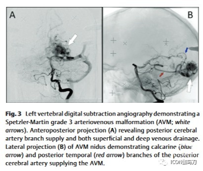 图3左椎体数字减影血管造影显示Spetzler-Martin 3级动静脉畸形(AVM;白色箭头)。正位投影(A)显示大脑后动脉分支供血以及浅静脉和深静脉引流。侧位投影(B)显示供应动静脉的大脑后动脉的胼胝体分支(蓝色箭头)和颞后部分支(红色箭头)。