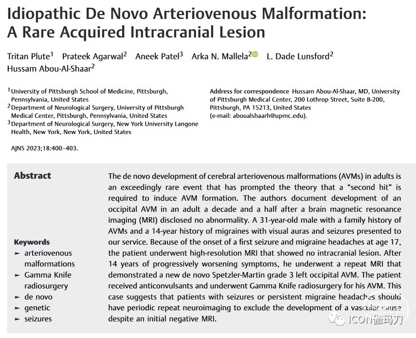 《Asian Journal of Neurosurgery》杂志 2023年6月 16日刊载[18(2):400-403.]美国University of Pittsburgh Medical Center的Tritan Plute , Prateek Agarwal , Aneek Patel ,等撰写的《特发性新生动静脉畸形:一种罕见的后天性颅内病变Idiopathic De Novo Arteriovenous Malformation: A Rare Acquired Intracranial Lesion》(doi: 10.1055/s-0043-1769893.)。