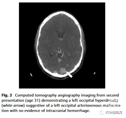 图2第二例患者(31岁)的ct血管造影显示左侧枕部高密度(白色箭头),提示左侧枕部动静脉畸形,无颅内出血迹象。