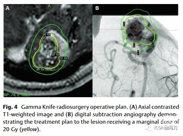 图4伽玛刀放射外科手术方案。(A)轴向对比T1加权图像和(B)数字减影血管造影显示病灶接受20 Gy边缘剂量的治疗计划(黄色)。
