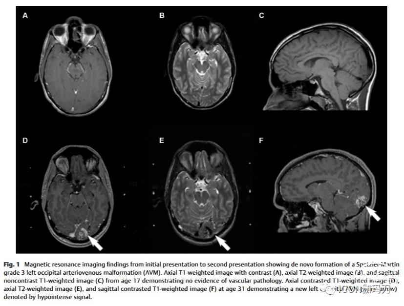 图1磁共振成像结果从最初的表现到第二次表现显示重新形成的Spetzler-Martin 3级左枕动静脉畸形(AVM)。17岁的轴位T1加权图像(A),轴位T2加权图像(B)和矢状面平扫的T1加权图像(C)显示没有血管病变的证据。31岁时,轴向T1加权对比像(D)、轴向T2加权像(E)和矢状面T1加权对比像(F)显示新的左枕部AVM(白色箭头),以低信号显示。
