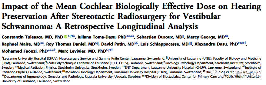 《Neurosurgery》杂志 2023 年7月 11日在线发表瑞士和瑞典的Constantin Tuleasca , Iuliana Toma-Dasu , Sebastien Duroux 等撰写的 《立体定向放射外科治疗前庭神经鞘瘤后平均耳蜗受照生物效应剂量对听力保留的影响:回顾性纵向分析。Impact of the Mean Cochlear Biologically Effective Dose on Hearing Preservation After Stereotactic Radiosurgery for Vestibular Schwannoma: A Retrospective Longitudinal Analysis》(doi: 10.1227/neu.0000000000002609.)。
