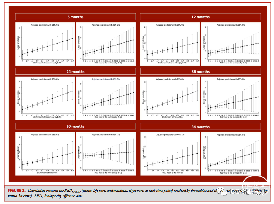 图2:每个时间点耳蜗受照的BEDGy2.47(左侧平均值和右侧最大值)与纯音平均损失(随访减去基线)的相关性。BED,生物效应剂量。