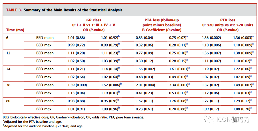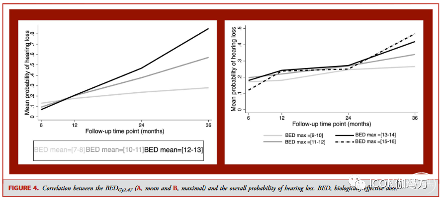 对于8、9、10、12、14和15 Gy2.47的BEDGy2.47 max, 36个月时听力下降的风险分别为21.3%、26.6%、30%、38.6%、45.1%和46.8%。