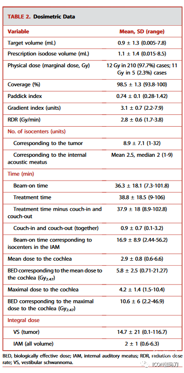 耳蜗的生物效应剂量计算为α / β比2.47 (BEDGy2.47),使用最初由Fowler开发的方法,并由Barendsen和Hopewell进一步讨论。我们最初考虑的是出束时间(the beam-on time),治疗时长(treatment time)由以下公式生成:[n * t + (n−1)* 0.1分钟],其中n为等中心数,t为等中心治疗持续时间。
