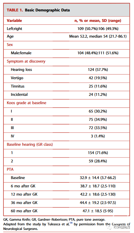 我们随访并纳入了213例治疗前听力正常的患者(Gardner-Robertson [GR]分级I和II20)。他们于2010年6月(我们的放射外科活动开始)至2019年12月在瑞士洛桑大学医院伽玛刀中心接受治疗。排除标准如下:不能给予书面知情同意,既往接受过放疗照射,既往接受过手术的患者,或存在神经纤维瘤病II型或耳蜗内肿瘤的患者。
