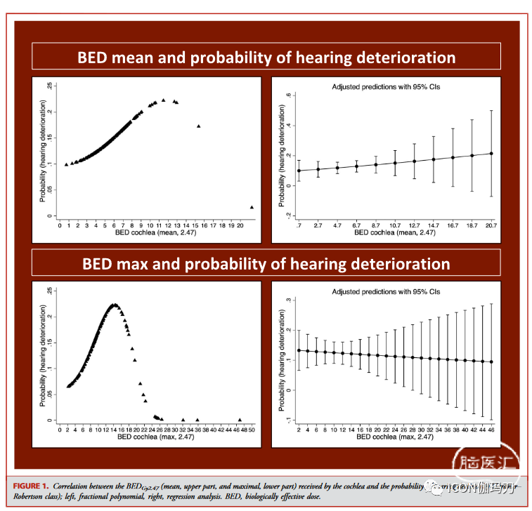 图1:耳蜗受照的BEDGy2.47(平均值上、最大值下)与听力下降概率的相关性(Gardner-Robertson分级);左,分数多项式,右,回归分析。BED,生物效应剂量。