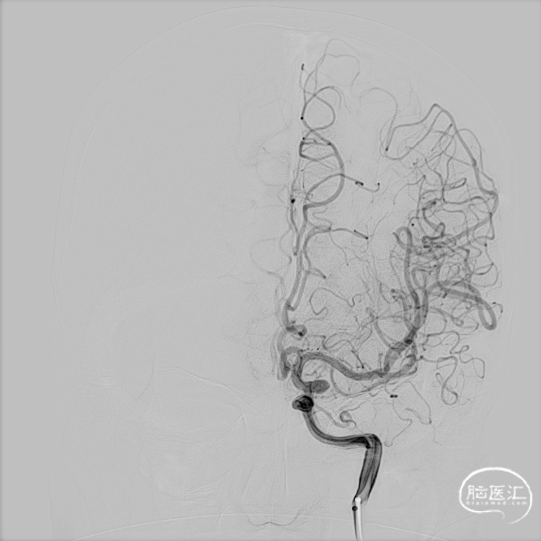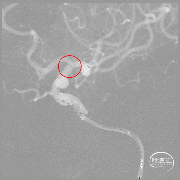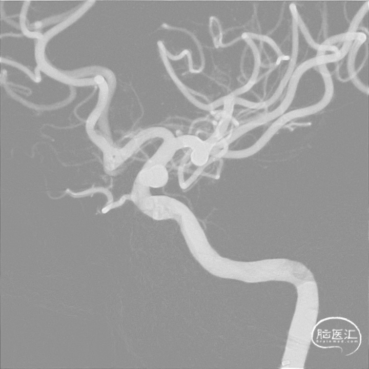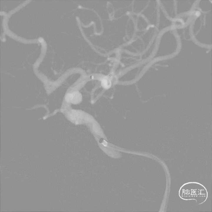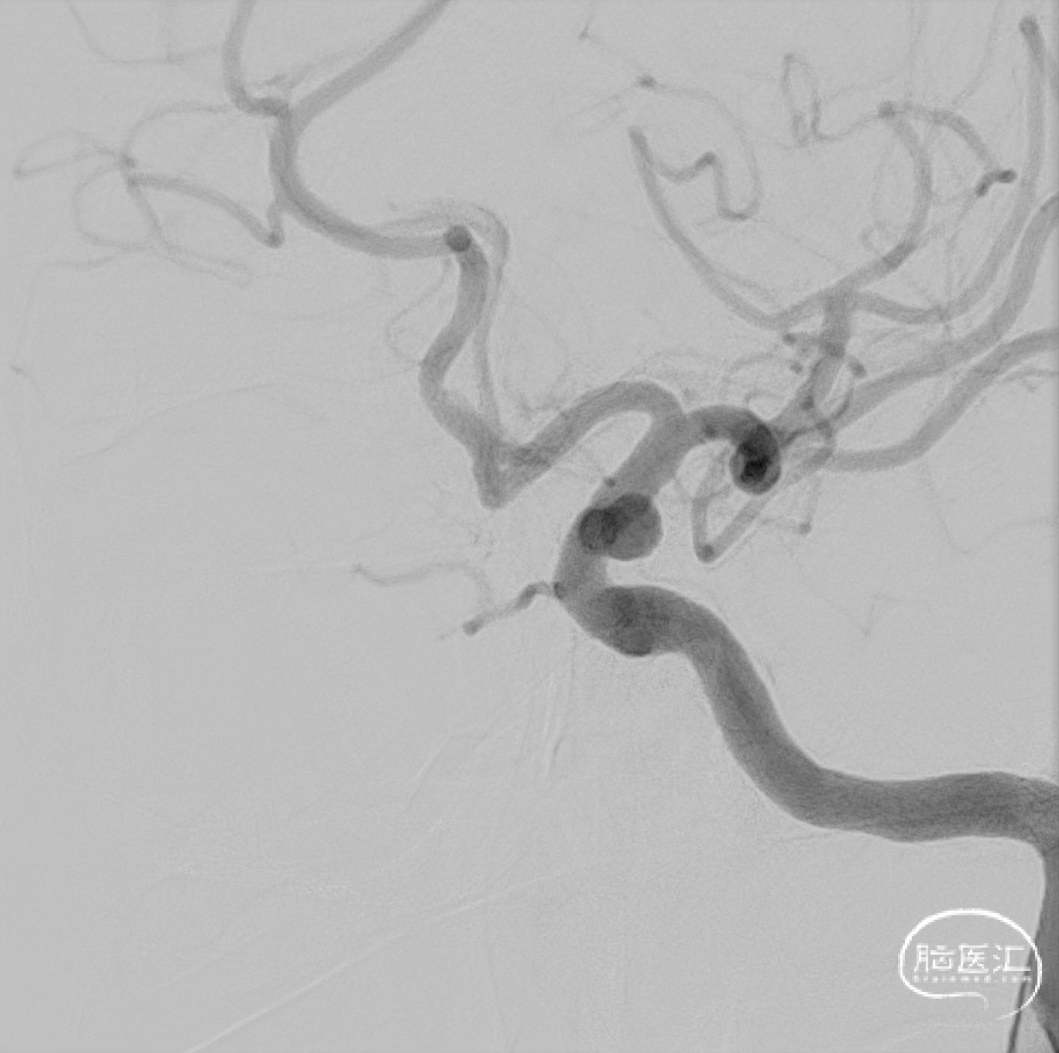 取平卧位,全身麻醉后行右侧股动脉穿刺,建立治疗通路。术中右侧颈内动脉造影明确动脉瘤位置。