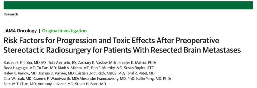 2023年6月8日发表在《JAMA Oncology》(IF:33.006/Q1 TOP)上的一项新研究,旨在从一组多中心扩大队列中确定患者接受术前SRS的局部和MD进展风险因素以及毒性效应。